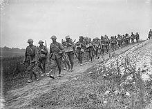The 1/5th, 1/6th, 1/7th and 1/8th battalions landed in France as part of the Sherwood Foresters Brigade in the North Midland Division (later 139th (Sherwood Foresters) Brigade and 46th (North Midland) Division respectively) in February 1915 for service on the Western Front.[10][11] The 2nd-Line TF battalions formed on the outbreak of war, the 2/5th, 2/6th, 2/7th and 2/8th battalions, moved to Ireland as part of the 178th (2/1st Nottinghamshire and Derbyshire) Brigade in the 59th (2nd North Midland) Division in April 1916.[10] During the Easter Rising in Ireland, the 2/7th and 2/8th battalions lost over two hundred men killed or wounded at Mount Street on 26 April and at the South Dublin Union on 27 April.[12] The 2/5th, 2/7th and the 2/8th battalions transferred to Le Havre in February 1917 for service on the Western Front while the 2/6th battalion transferred to Boulogne-sur-Mer in February 1917 also for service on the Western Front. 3rd-Line TF battalions (3/5h, 3/6th, 3/7th and 3/8th) were also formed to train drafts for the battalions overseas. The 21st Battalion was formed from Home Service men of the TF.[10]