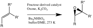 The reaction is mediated by a D-fructose derived catalyst, which produces the (R,R) enantiomer of the resulting epoxide. Solubilities of olefin organic substrate and oxidant (oxone) differ, and thus a biphasic medium is needed. The generation of the active catalyst species takes place in the aqueous layer, and is shuttled to the organic layer with the reactants by tetrabutylammonium sulfate.The ketone catalyst is continuously regenerated in a catalytic cycle, and thus can catalyze the epoxidation in small amounts.