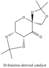 The catalyst discovered by Yian Shi's group in 1996 was derived from D-fructose, and has a stereogenic center close to the reacting center (ketone)- the rigid six-membered ring structure of the catalyst and adjacent quaternary ring group minimizes epimerization of this stereocenter. Oxidation by the active dioxirane catalyst takes place from the si-face, due to steric hindrance of the opposing re-face. This catalyst functions efficiently as an asymmetric catalyst for unfunctionalized trans-olefins.[2]