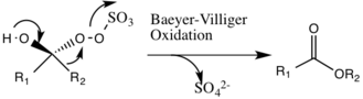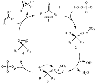 The first step in the catalytic cycle reaction is the nucleophilic addition reaction of the oxone with the ketone group on the catalyst (intermediate 1). This forms the reactive intermediate number 2 species, the Criegee intermediate that can potentially lead to unwanted side reactions, such as the Baeyer-Villiger reaction (see below). The generation of intermediate species number 3 occurs under basic conditions, with a removal of the hydrogen from the hydroxy group to form a nucleophilic oxygen anion. The sulfate group facilitates the subsequent formation of the dioxirane, intermediate species number 4, by acting as a good leaving group during the 3-exo-trig cyclization. The activated dioxirane catalytic species then transfers an oxygen atom to the alkene, leading to a regeneration of the original catalyst.[3]