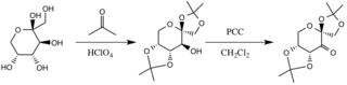 The catalyst is formed by reaction with acetone under basic conditions, with the hydroxyl groups of the fructose ring acting as nucleophiles, their nucleophilicity increased by the basic conditions created by potassium carbonate. The electron withdrawing substituents (alpha-ether groups) encourage the formation of the ketone from the oxidizing agent pyridinium chlorochromate by increasing the electrophilicity of the carbonyl carbon, via a stabilizing delocalization of the forming π C-C bonds into the σ* C-O bonds of the adjacent ethers.[3]