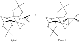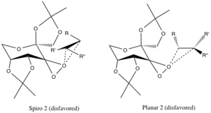 Donation of these electrons into the forming C-O σ bonds of the epoxide bonds also encourages the formation of the spiro-product (the geometry of the product is aligned as well). The planar configuration is disfavored due to lack of pi-backbonding and steric hindrance of the alkyl groups with large alkyl functional groups of the catalytic ring.[4]