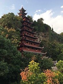 Shibaozhai (simplified Chinese: 石宝寨; traditional Chinese: 石寶寨; pinyin: shí bǎo zhài; lit. 'Precious Stone Fortress') is a hill along the bank of the Yangtze River (Chang Jiang) in Zhong County, Chongqing, China. This rocky and craggy hill has extremely steep sides and is about 200 meters (660 feet) tall. On the river side is a red pavilion which leans against the side of the hill providing a walkway to the temple at the top. One of the largest wooden temple, red pavilion built at the side of rock and has nine floors. A yellow entrance at the base of the pavilion provides an entrance.