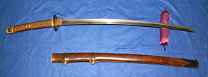 During the Meiji period, the samurai class was gradually disbanded, and the Haitōrei Edict in 1876 forbade the carrying of swords in public except for certain individuals such as former samurai lords (daimyōs), the military and police.[2] Skilled swordsmiths had trouble making a living during this period as Japan modernized its military and many swordsmiths started making other items such as cutlery. Military action by Japan in China and Russia during the Meiji Period helped revive the manufacture of swords and in the Shōwa period (1926–1989) before and during World War II swords were once again produced on a large scale.[3]