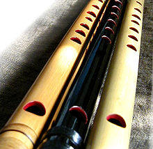 The shinobue (kanji: 篠笛; also called takebue (kanji: 竹笛) in the context of Japanese traditional arts) is a Japanese transverse flute or fue that has a high-pitched sound. It is found in hayashi and nagauta ensembles, and plays important roles in noh and kabuki theatre music. It is heard in Shinto music such as kagura-den and in traditional Japanese folk songs. There are two styles: uta (song) and hayashi (festival). The uta is properly tuned to the Western scale, and can be played in ensembles or as a solo instrument. The hayashi is not in the correct pitch, because it is simply a piece of hollow bamboo with holes cut into it. It emits a very high-pitched sound, and is appropriate for the festival/folk music of Japan. Both shinobue flutes play a very important role in the Japanese theater.