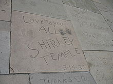 On December 28, 1934, Bright Eyes was released. It was the first feature film crafted specifically for the girl's talents and the first where her name appeared over the title.[30][31] Her signature song, "On the Good Ship Lollipop", was introduced in the film and sold 500,000 sheet-music copies. In February 1935, Shirley Temple became the first child star to be honored with a miniature Juvenile Oscar for her film accomplishments,[32][33][34][note 3] and she added her foot- and handprints to the forecourt at Grauman's Chinese Theatre a month later.[35]