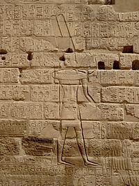 In the very early years after the decipherment of Egyptian hieroglyphs, on chronological, historical, and linguistic grounds, nearly all Egyptologists identified Shishak with Shoshenq I of the 22nd dynasty, who invaded Canaan following the Battle of Bitter Lakes.[1] This position was maintained by most scholars ever since, and is still the majority position. The fact that Shoshenq I left behind "explicit records of a campaign into Canaan (scenes; a long list of Canaanite place-names from the Negev to Galilee; stelae), including a stela [found] at Megiddo" supports the traditional interpretation.[6][7][8] There are however some notable exceptions, such as Jerusalem itself which is not mentioned in any of his campaign records.[6][7][8] This would seem contradictory to the biblical account which explicitly mentions Jerusalem. Nevertheless, a common variant of Shoshenq's name omits its 'n' glyphs, resulting in a pronunciation like, "Shoshek".[9]