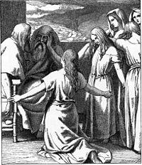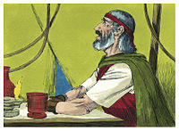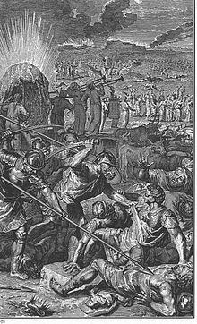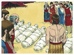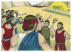 In the fourth reading, God swore that all of the men 20 years old and up, except Caleb and Joshua, would die in the wilderness.[22] God said that the Israelites' children would enter the Promised Land after roaming the wilderness, suffering for the faithlessness of the present generation, for 40 years, corresponding to the number of days that the scouts scouted the land.[23] The scouts other than Caleb and Joshua died of plague.[24] Early the next morning, the Israelites set out to the Promised Land, but Moses told them that they would not succeed without God in their midst.[25] But they marched forward anyway, and the Amalekites and the Canaanites dealt them a shattering blow at Hormah.[26] God told Moses to tell Israelites that when they entered the Promised Land and would present an offering to God, the person presenting the offering was also to bring flour mixed with oil and wine.[27]