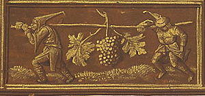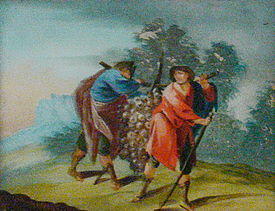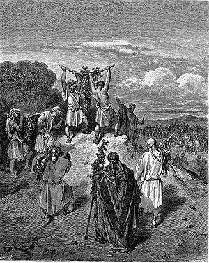 The Gemara interpreted the words "between two" in Numbers 13:23 to teach that the scouts carried the large cluster of grape on two staffs. Rabbi Isaac said that the scouts carried the grapes with a series of balancing poles. The Gemara explained that eight spies carried the grape-cluster, one carried a pomegranate, one carried a fig, and Joshua and Caleb did not carry anything, either because they were the most distinguished of them, or because they did not share in the plan to discourage the Israelites.[64]