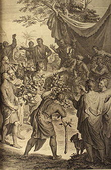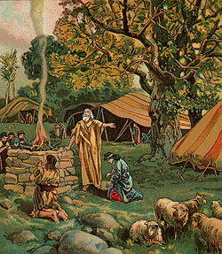 The Hebrew Bible also includes several ambiguous reports in which Abraham or Isaac built or returned to an altar and "called upon the name of the Lord."[52] In these cases, the text implies but does not explicitly state that the Patriarch offered a sacrifice.[53] And at God's request, Abraham conducted an unusual sacrifice at the Covenant between the Pieces in Genesis 15:9–21.