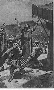 In the seventh reading, if an individual sinned unwittingly, the individual was to offer a she-goat in its first year as a sin offering, and the priest would make expiation that the individual might be forgiven.[32] But the person who violated a commandment defiantly was to be cut off from among his people.[33] Once the Israelites came upon a man gathering wood on the Sabbath day, and they brought him before Moses, Aaron, and the community and placed him in custody.[34] God told Moses that the whole community was to stone him to death outside the camp, so they did so.[35] God told Moses to instruct the Israelites to make for themselves fringes (צִיצִת, tzitzit) on each of the corners of their garments.[36] They were to look at the fringes, recall the commandments, and observe them.[37]