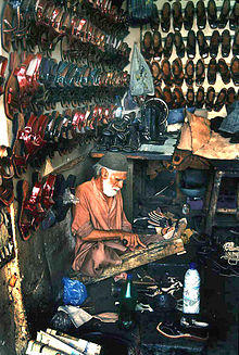 The shoemaking trade flourished in the eighteenth and early nineteenth centuries but began to be affected by industrialization in the later nineteenth century.[2] Traditional handicraft shoemaking has now been largely superseded in volume of shoes produced by industrial mass production of footwear, but not necessarily in quality, attention to detail, or craftsmanship. Today, most shoes are made on a volume basis, rather than a craft basis.[3] A pair of "bespoke" shoes, made in 2020 according to traditional practices, can be sold for thousands of dollars.[4]