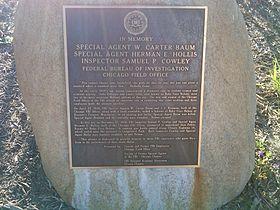 A plaque at the Barrington Park District in Barrington, Illinois commemorates the site of the Battle of Barrington, a 1934 shootout that claimed the lives of two FBI agents and resulted in the death of notorious Chicago gangster Baby Face Nelson.