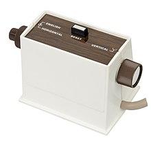 The Odyssey consists of a black, white, and brown oblong box connected by wires to two rectangular controllers. The console connects to the television set through an included switchbox, which allows the player to switch the television input between the Odyssey and the regular television input cable, and presents itself like a television channel on channel three or four, which thereafter became the standard for game consoles.[1] The controllers, designed to sit on a flat surface, contain one button marked Reset on the top of the controller and three knobs: one on the right side of the controller, and two on the left with one extending from the other. The reset button resets individual elements depending on the game, such as making a player's dot visible after it is turned off. The system can be powered by six C batteries, which were included; an optional AC power supply was sold separately.[2] The Odyssey lacks sound capability and can only display monochrome white shapes on a blank black screen.[3]