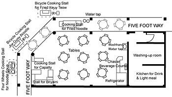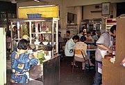 The front of the shop on the ground floor in most cases is used for commercial purposes, while the upper floors are intended for residential use.[13] The ground floor may serve as food and drink shops, offices, shops, or workshops. If the ground floor include living spaces (usually located at the back), it may be used as reception, guestrooms, and formal family rooms with ancestor altars. As the settlement prospered and population increased, some front shops were put to professional uses such as clinics, drugstores, law offices, pawnshops, travel agencies. Food and drink shops usually served economical selections, such as a variety of ready-cooked food of Chinese style, Padang style (Halal), or Siamese style. Cooking stalls rented a portion of space from the shop owner and served specific food such as fried noodles, fried rice, Indian pancakes, noodle soup. A variety of drinks was served by a different stall, sometimes by the shop owner. Such stalls have been replaced by food courts.