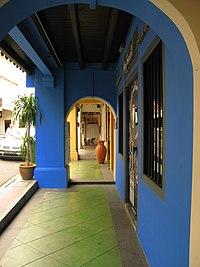 In 1822, instructions were issued by Sir Stamford Raffles for the Town Plan of Singapore which specified that each house had to provide a "verandah of a certain depth, open at all times as a continued and covered passage on each side of the street".[6] Raffles' instructions created a regular and uniform townscape in Singapore with arcades or colonnades forming a continuous public pathways. Later in other Straits Settlements, the "continued covered passage" known as "five foot way" was also mandated, and it became a distinctive feature of the "Strait Settlement Style" buildings.[7][3] This feature also spread to other South East Asian countries after the mid-19th century such as Thailand and the Philippines, as well as some East Asian countries.[3]