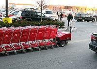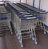 Electronic systems are sometimes used by retailers. Each shopping cart is fitted with an electronic locking wheel clamp, or "boot".[32] A transmitter with a thin wire is placed around the perimeter of the parking lot, and the boot locks when the cart leaves the designated area. Store personnel must then deactivate the lock with a handheld remote control to return the cart to stock. Often, a line is painted in front of the broadcast range to warn customers that their cart will stop when rolled past the line. However, these systems are very expensive to install and although helpful, are not foolproof. The wheels can be lifted over the electronic barrier and/or pushed hard enough that the locks break.[30][33] There are also safety concerns if the person pushing the trolley is running, and also if the trolley doesn't lock and is taken onto a road, locking due to magnetic materials under the road. Some cities have required retailers to install locking wheel systems on their shopping carts. In some cases, electronic systems companies have encouraged passage of such laws to create a captive audience of potential customers.[34]