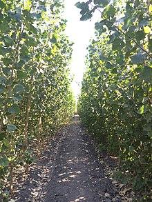 Saplings are planted at a high density, as much as 15,000 per hectare for willow and 12,000 per hectare for poplar.[3] Willow SRC can be established according to two different layouts. In most North European countries (Sweden, UK, Denmark) and in the US, the most frequent planting scheme is the double row design with 0.75 m distance between the double rows and 1.5 m to the next double row, and a distance between plants ranging from 1 m to 0.4 m, corresponding to an initial planting density of 10,000 - 25,000 plants ha−1.[8] In other countries like Canada, a single row design ranging from 0.33 m between plants on a row and 1.5 m between rows (20,000 plants ha-1) to 0.30 m on the row and 1.80 m between rows (18,000 plants ha-1) is more common.[9] Planting takes place around March to take advantage of the high moisture of the soil in the spring and the amount of sunshine in the early summer. The most efficient planting machines plant four rows at a time and can plant a hectare in around three hours. Saplings are left to grow for one or two years and then coppiced.