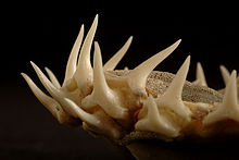 Shortfin mako sharks, as with most other sharks, are aged by sectioning vertebrae — one of the few bony structures in sharks — and counting growth bands. The age of shortfin mako, and therefore important parameters, such as age at sexual maturity and longevity, were severely underestimated until 2006 (e.g. claims of sexual maturity at 4–6 years, claims of longevity as low as 11 years), because of a poorly supported belief that shortfin mako sharks deposited two growth bands per year in their vertebrae. This belief was overturned by a landmark study which proved that shortfin mako sharks only deposit one band in their vertebrae per year, as well as providing validated ages for numerous specimens.[26] Natanson et al. (2006) aged 258 shortfin mako specimens and recorded: