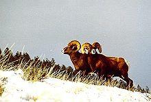 Native herbivores such as the moose are found in small numbers near waterways, especially at lower elevations. Moose populations in northwestern Wyoming and other areas of North America have been on the decline since the end of the 20th century, possibly due to a parasite.[54] There were an estimated 739 moose in the forest in 2006 which is almost 300 fewer than there were 20 years earlier.[53][55] Other ungulate species are much more common and there are over 20,000 elk (also known as wapiti) and 40,000 mule deer.[55] Bighorn sheep and mountain goats inhabit the rocky terrain and highest elevations. During the winter, one of the largest bighorn sheep herds in the lower 48 states congregate in the region around Dubois, Wyoming; however, their numbers since 1990 have been diminished due to disease transmitted from contact with domesticated sheep and goats.[56] An estimated 5,000 bighorn sheep are found throughout the forest and a small but stable population of 200 mountain goats reside in the northernmost portions of the forest.[55] Bison and pronghorn antelope are two other ungulates that live on the forest and have sustainable populations.[51]