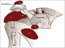- The subcoracoid bursa is between the capsule and the coracoid process of the scapula.