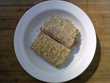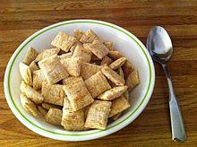Shredded wheat is a breakfast cereal made from whole wheat formed into pillow-shaped biscuits. It is commonly available in three sizes: original, bite-sized (¾×1 in) and miniature (nearly half the size of the bite-sized pieces). Both smaller sizes are available in a frosted variety, which has one side coated with sugar and usually gelatin. Some manufacturers have produced "filled" versions of the bite-size cereal containing a raisin at the center, or apricot, blueberry, raspberry, cherry, cranberry or golden syrup filling.
