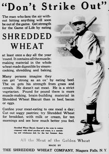 Premiering to the public at Chicago's World Columbian Exposition in 1893,[4] shredded wheat cereal was then manufactured by The Natural Food Company in Niagara Falls, New York in 1901. It became the Shredded Wheat Company in 1904. It was bought by Nabisco (National Biscuit Company) in December 1928.[5]