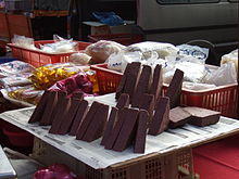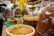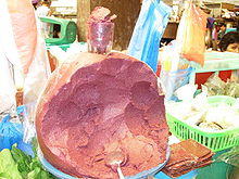Shrimp paste may vary in appearance from pale liquid sauces to solid chocolate-coloured blocks. Shrimp paste produced in Hong Kong and Vietnam is typically a light pinkish grey; while the type used for Burmese, Lao, Cambodian, Thai and Indonesian cooking is darker brown. In the Philippines, they are commonly bright red or pink, due to the use of angkak (red yeast rice) as a colouring agent.[4][5] While all shrimp paste has a pungent aroma, the scent of higher grade shrimp paste is generally milder. Markets near villages producing shrimp paste are the best places to obtain the highest quality product. Shrimp paste varies between different Asian cultures and can vary in smell, texture and saltiness.[6]