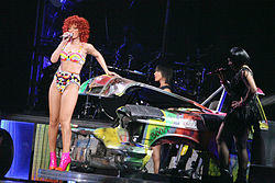 She also performed it at the 2009 Super Bowl, which was held at the Pepsi Center in Denver, Colorado.[34] According to Gil Kaufman from MTV, the performance featured "a chair dance, lots of funky wah-wah and screaming guitar solos, and graphics of spinning rims and neon speed gauges on the mega screens".[34] Rihanna performed "Shut Up and Drive" on her three major tours: Good Girl Gone Bad (2007–09), Last Girl on Earth (2010–11) and the Loud Tour (2011).[35][36][37] The performances of the song on the Last Girl on Earth and the Loud Tour shows, featured a car present on the stage.[36][37] In a review of one of the shows from the Loud Tour, Jonathan McCambridge from Belfast Telegraph commented about the performance, "'During Shut Up And Drive', a car appeared from underneath the stage and a number of dancers then proceeded to pretend to batter the hell out of it for no obvious reason."[37]
