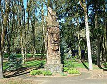 The city's parks commission approved plans to build the permanent stage in the park in September 1982 using private funds.[13] In 1987, the 25-foot (7.6 m) Peter Wolf Toth statue, Chief Kno-Tah, was added along the eastern side of the park.[14] It is one of 74 such statues collectively known as the Trail of the Whispering Giants. In 2006, the city celebrated the 100th anniversary of the park that included people in period dress and a performance by the Oregon Symphonic Band.[15] Many of the Douglas fir trees at the park were found to have schweinitzii butt rot and red ring rot in 2008.[16] In May 2009, the city began removing those diseased trees that posed a danger to park visitors as the trees slowly died.[16] Additional trees were removed in 2013 as part of the renovations to the library.[17]