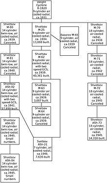 The progenitor for the ASh-73 was the M-70. It was tested in late 1938 and was a failure because of cracks in the master connecting rod and the geared centrifugal supercharger's impeller. The exhaust valves also burnt through. The M-71 of 1939 was the successor to the M-70 and it too was not a success. It used some components from the M-62 engine, but its development was slowed by the German attack on the Soviet Union in 1941. It passed its State acceptance tests in the autumn of 1942, but was not placed into production as there was not any production capacity available, although it was tested on a number of different prototypes during the war. The M-72 of early 1945 was a boosted version of the M-71 and was superseded by the ASh-73 before production could get underway.[2]
