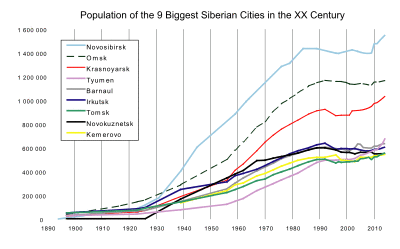 The first great modern change in Siberia was the Trans-Siberian Railway, constructed during 1891–1916. It linked Siberia more closely to the rapidly industrialising Russia of Nicholas II. Around seven million people moved to Siberia from European Russia between 1801 and 1914.[15] From 1859 to 1917, more than half a million people migrated to the Russian Far East.[16] Siberia has extensive natural resources. During the 20th century, large-scale exploitation of these was developed, and industrial towns cropped up throughout the region.[17]