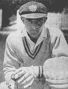 Barnes was selected for New South Wales for the opening match of the 1937–38 season against Queensland making 68 in a rain-affected match. Against the touring New Zealanders, Barnes fell just short of his maiden first-class century, scoring 97.[16] He appeared to have reached the landmark when scoring 127 not out against Western Australia, but the New South Wales Cricket Association retrospectively deemed the match to be not of first-class status, angering Barnes.[16] He finally scored his maiden first-class century (110) against Victoria in the final game of the season, completing his hundred while bleeding profusely after being struck on the jaw by a ball delivered by Ernie McCormick.[17] As a result of his performances over the season (scoring over 800 runs, averaging 50.56),[18] Barnes was selected as the youngest member of the Australian cricket team to tour England in 1938.[19]