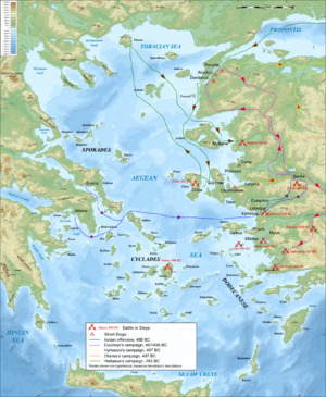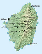 Indeed, this period in Greek history is remarkable for the social and political upheaval in many Greek cities, particularly the establishment of the first democracy in Athens.[7] The island of Naxos, part of the Cyclades group in the Aegean Sea, was also in this period affected by political turmoil. Naxos had been ruled by the tyrant Lygdamis, a protege of the Athenian tyrant Peisistratos, until around 524 BC, when he was overthrown by the Spartans. After this, a native aristocracy seems to have flourished, and Naxos became one of the most prosperous and powerful of the Aegean islands.[7][8] Despite its success, Naxos was not immune to class tensions and internal strife, and shortly before 500 BC, the population seized power, expelling the aristocrats and establishing a democracy.[7][9]