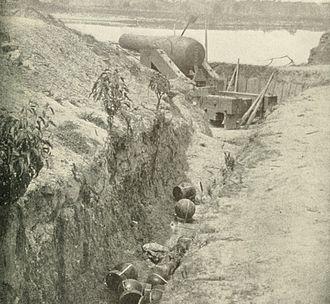 General Breckinridge was soon ordered to take most of his troops to Kentucky, however, and on August 18 he left, leaving only 1,500 men to work on the fortifications under Ruggles' command. Ruggles did have a forty-two-pounder smoothbore cannon, which he mounted immediately, manned by former sailors of the CSS Arkansas. it had been destroyed in the Battle of Baton Rouge that year. Two thirty-two-pounders were shortly added from the abandoned wreck of the USS Sumter.[12]