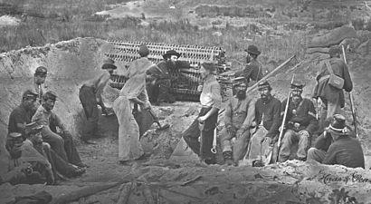 A nine-inch (229 mm) Union navy Dahlgren gun set up on land for siege work as they were at battery ten at Port Hudson. The gun is whitewashed so it can be more easily worked at night. The projections at the breech are for the navy double vent percussion firing system. The crewman at the far right is wearing the Union navy uniform.