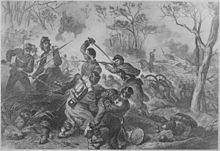 The Guard first had to advance over the pontoon bridge, along Telegraph Road with a fortified ridge to their left manned by William B. Shelby's 39th Mississippi troops supported by a light artillery battery, the Confederate heavy artillery batteries to their front, and the Mississippi river to their immediate left. Despite the heavy crossfire from rifles, field artillery, and heavy coast guns, the Louisiana Native Guards advanced with determination and courage, led by Captain Andre Cailloux, a free black citizen of New Orleans. Giving orders in English and French, Cailloux led the Guard regiments forward until killed by artillery fire. Taking heavy losses, the attackers were forced to retreat to avoid annihilation. This fearless advance did much to dissipate the belief that black troops were unreliable under fire.[26]