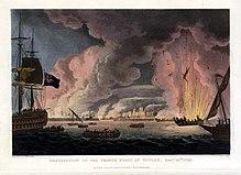 At 20:00 Captain Charles Hare brought the fire ship HMS Vulcan into the New Arsenal. Smith halted the ship across the row of anchored French ships of the line, and lit the fuses at 22:00. Hare was badly wounded by an early detonation as he attempted to leave his ship.[14] Simultaneously, fire parties set alight the warehouses and stores ashore, including the mast house and the hemp and timber stores, creating an inferno across the harbour as Vulcan's cannons fired a last salvo at the French positions on the shore.[15] With the fires spreading through the dockyards and New Arsenal, Smith began to withdraw. His force was illuminated by the flames, making an inviting target for the Republican batteries. As his boats passed the Iris however the powder ship suddenly and unexpectedly exploded, blasting debris in a wide circle and sinking two of the British boats. On Britannia all of the crew survived, but the blast killed the master and three men on Union.[16]