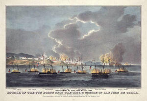 On March 22, Morales declined a surrender demand from Scott, and the American batteries opened fire at 4:15 pm followed by those of Commander Josiah Tattnall's Mosquito Fleet at 5:45 pm.[1]:249 The Naval battery's heavy cannonballs easily broke the coral walls.[1]:250 Congreve rockets were fired into the defenses[1]:250 and the combined fire forced the abandonment of Fort Santiago and Mexican morale began to drop[1]:250 as civilian deaths reached the hundreds.[4]