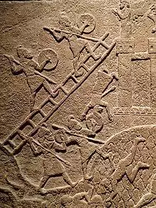 The first siege equipment is known from Egyptian tomb reliefs of the 24th century BC, showing Egyptian soldiers storming Canaanite town walls on wheeled siege ladders. Later Egyptian temple reliefs of the 13th century BC portray the violent siege of Dapur, a Syrian city, with soldiers climbing scale ladders supported by archers.