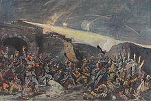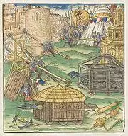 A siege is a military blockade of a city, or fortress, with the intent of conquering by attrition, or a well-prepared assault. This derives from Latin: sedere, lit. 'to sit'.[1] Siege warfare is a form of constant, low-intensity conflict characterized by one party holding a strong, static, defensive position. Consequently, an opportunity for negotiation between combatants is not uncommon, as proximity and fluctuating advantage can encourage diplomacy. The art of conducting and resisting sieges is called siege warfare, siegecraft, or poliorcetics.