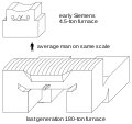 In 1865, the French engineer Pierre-Émile Martin took out a license from Siemens and first applied his regenerative furnace for making steel. The most appealing characteristic of the Siemens regenerative furnace is the rapid production of large quantities of basic steel, used for example to construct high-rise buildings.[5] The usual size of furnaces is 50 to 100 tons, but for some special processes they may have a capacity of 250 or even 500 tons.