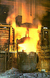 Open-hearth furnaces are one of several kinds of furnace in which excess carbon and other impurities are burnt out of pig iron to produce steel.[1] Since steel is difficult to manufacture owing to its high melting point, normal fuels and furnaces were insufficient and the open-hearth furnace was developed to overcome this difficulty. Compared to Bessemer steel, which it displaced, its main advantages were that it did not expose the steel to excessive nitrogen (which would cause the steel to become brittle), was easier to control, and permitted the melting and refining of large amounts of scrap iron and steel.[2]