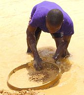 The Eastern and Southern districts in Sierra Leone, most notably the Kono and Kenema districts, are rich in alluvial diamonds, and more importantly, are easily accessible by anyone with a shovel, sieve, and transport.[28] Since their discovery in the early 1930s, diamonds have been critical in financing the continuing pattern of corruption and personal aggrandizement at the expense of needed public services, institutions, and infrastructure.[29] The phenomenon whereby countries with an abundance of natural resources tend to nonetheless be characterized by lower levels of economic development is known as the "resource curse".[30]