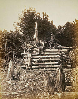 Although the Confederate Signal Corps would never achieve a distinct branch identity to the extent that the Union version did, the Confederate Congress authorized its establishment as a separate organization, attached to the Adjutant and Inspector General's Department, on April 19, 1862, a year before the U.S. Congress did so. The first chief signal officer was Captain William Norris, a Maryland lawyer then a civilian volunteer on the staff of Maj. Gen. John B. Magruder.[13] The corps under Norris was organized to consist of one major, 10 captains, 20 lieutenants, 20 sergeants, and 1500 men detailed from all branches of the service. A signal officer was authorized for the staff at each corps and division. The Confederate Signal Corps perform duties and utilized equipment very similar to their Northern counterparts, with some exceptions. Electric telegraphy was not used in tactical battlefield communications due to shortages of telegraph wire and trained operators. Their aerial telegraphy was performed with similar flags, but with slightly modified codes and movements from the Myer methods. Unlike the Union Signal Corps, however, the Confederate Signal Corps also was chartered to conduct espionage for the South. (Both services provided valuable battlefield intelligence, and sometimes artillery fire direction, from their elevated observation points, but the Confederate corpsmen performed undercover missions behind enemy lines as well.) Acting as the Secret Service of the Confederacy, the corps administered the Secret Line, an information network that ran between Richmond and the North and extended into Canada. It is because of its clandestine nature that much of the work of the Confederate Signal Corps is lost to history. Many of its records were burned in the fall of Richmond and in a subsequent fire at Norris's home, which claimed his personal papers.[13]
