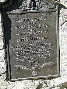 The Battle of Gettysburg featured the Union Signal Corps in its role of observing the battlefield. The chief signal officer of the Army of the Potomac, Captain Lemuel B. Norton, had field telegraph trains at his disposal, but did not deploy them. On July 1, 1863, a Union signal officer, Lt. Aaron B. Jerome, ascended the cupola of the Lutheran Theological Seminary and the courthouse steeple to observe the enemy's approach and reported to Maj. Gen. Oliver O. Howard. On July 2, the Confederate corps under Lt. Gen. James Longstreet attempted to maneuver into position for an attack on the Union left flank. They were forced into a lengthy counter march, delaying their attack, when they spotted the presence of the Union signal station on Little Round Top mountain and knew that their approach would be reported. During the Confederate assault, the fighting was so heavy that the signal station had to be abandoned until the following day. A plaque commemorating the U.S. Army Signal Corps' contribution to the battle is mounted today on a boulder near the peak of Little Round Top. On July 3, before Pickett's Charge, artillery fire against the Union line was so intense that the signalmen could not use their flags. Captain Edward C. Pierce, a signal officer attached to the VI Corps, acted as a mounted courier to Maj. Gen. George G. Meade's headquarters, despite warnings that he would never make it alive through the firing.