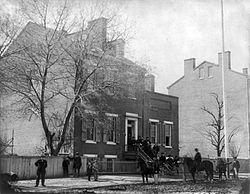 Upon the outbreak of war, Myer returned to Washington and addressed the problem of having no signal personnel. His only option was to persuade officers to be detailed from other assignments, which was not considered satisfactory by Myer or the officers themselves, who feared loss of promotion opportunities. He submitted draft legislation to Secretary of War Simon Cameron in August 1861, proposing that a Signal Corps be established with himself, seven assistant signal officers, 40 warrant officers, and 40 signal artificers to serve as line builders and repairmen. He intended that each division of the Army, which he assumed would eventually comprise 500,000 men, would have dedicated aerial and electromagnetic telegraphy support. Congress adjourned without considering the legislation. That fall, Myer, who in addition to being chief signal officer for the Army, served as chief signal officer of the newly formed Army of the Potomac, set up training facilities for detailed officers and men in Fort Monroe and at Red Hill, Georgetown, Washington, D.C. His latter training camp remained in operation through the Peninsula Campaign and the rest of 1862, a period in which he continued to lobby with Congress and the Secretary of War, now Edwin M. Stanton, to establish a permanent corps.[7]