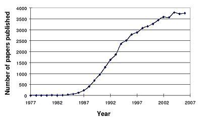 In 1970, Martin Rodbell examined the effects of glucagon on a rat's liver cell membrane receptor. He noted that guanosine triphosphate disassociated glucagon from this receptor and stimulated the G-protein, which strongly influenced the cell's metabolism. Thus, he deduced that the G-protein is a transducer that accepts glucagon molecules and affects the cell.[60] For this, he shared the 1994 Nobel Prize in Physiology or Medicine with Alfred G. Gilman. Thus, the characterization of RTKs and GPCRs led to the formulation of the concept of "signal transduction", a word first used in 1972.[61] Some early articles used the terms signal transmission and sensory transduction.[62][63] In 2007, a total of 48,377 scientific papers—including 11,211 review papers—were published on the subject. The term first appeared in a paper's title in 1979.[64][65] Widespread use of the term has been traced to a 1980 review article by Rodbell:[60][66] Research papers focusing on signal transduction first appeared in large numbers in the late 1980s and early 1990s.[46]