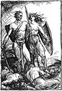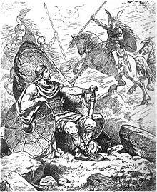Dagr is however obliged by honour to avenge his brothers and after having summoned Odin, the god gives him a spear. In a place called Fjoturlund, Dagr kills Helgi and goes back to his sister to tell her of his deed. Sigrún puts Dagr under a powerful curse after which he is obliged to live on carrion in the woods.