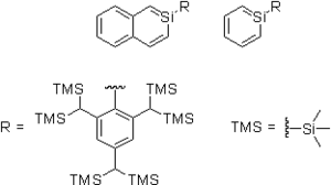 Following the synthesis of the naphthalene analog 2-silanaphthalene,[4][5] the first sila-aromatic compound, by Norihiro Tokitoh and Renji Okazaki in 1997, the same group reported thermally stable silabenzene in 2000 taking advantage of a new steric protective group.[6] A 9-silaanthracene derivative has been reported in 2002,[7] a 1-silanaphthalene also in 2002.[8]